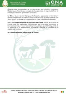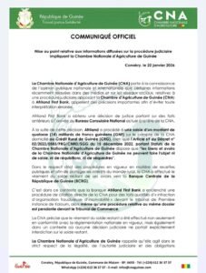 La Chambre Nationale d’Agriculture de Guinée (CNA) informe l’opinion publique nationale et internationale que certaines informations récemment diffusées dans des médias et sur les réseaux sociaux, faisant état d’une procédure judiciaire opposant la Chambre d’Agriculture de Guinée (CNA) à Afriland First Bank, nécessitent d’importantes clarifications.